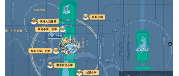 保利维塔所处的千灯湖CAZ(中央活力区)是佛山商业、文化、生态资源最密集的区域。步行5分钟即达千灯湖核心商圈,周边15座大型商业综合体环伺——包括保利水城、南海万达广场、天河城、宜家家居旗舰店、中海环宇城、万科广场等,国际品牌、米其林餐饮、IMAX影院一应俱全。文化方面,隔河相望的南海艺术中心(含大剧院、博物馆、体育中心)已启动建设,未来将形成湾区级文化地标。生态上,千灯湖公园三期、滨江公园、佛山水道绿廊等四大公园环绕,构建约1.5公里滨水绿芯,日常休闲与社交体验极为丰富。