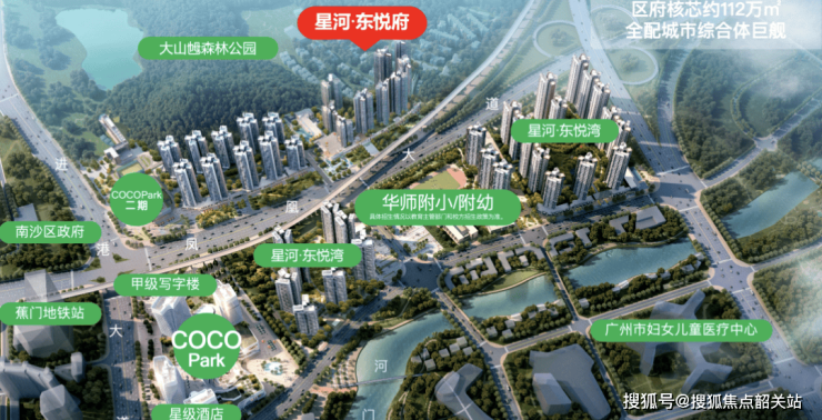 项目近邻已开业的星河COCOPARK 九点七万平米体量汇聚逾二百家品牌门店 包含影城 书店 健身与精品超市等多样业态 满足日常零售 餐饮 娱教休闲等多重需求 同时南沙区府作为城市客厅 正在推进约二万公顷级的城市中心区建设 将纳入展览馆 图书馆 体育馆 青少年宫等文体设施 未来文化氛围与公共服务将进一步增强 项目周边金洲蕉门等成熟商圈也形成互补 提供更多消费场景 在教育上 华师附小东悦湾校区与华师附中近在咫尺 构建从幼儿园到中学的完整教育链 医疗方面 三甲妇儿医院及南沙中心医院为居民提供日常及专科医疗保障 休闲方面 大山乸森林公园和蕉门河景观带提供天然户外空间 社区内部还规划有山体公园和全龄园林 设置儿童 成人 长者分区设施 形成内外两层的生活场景 综上所述 项目周边配套呈现出商业成熟 教育优质 医疗可靠 与自然生态共融的综合优势