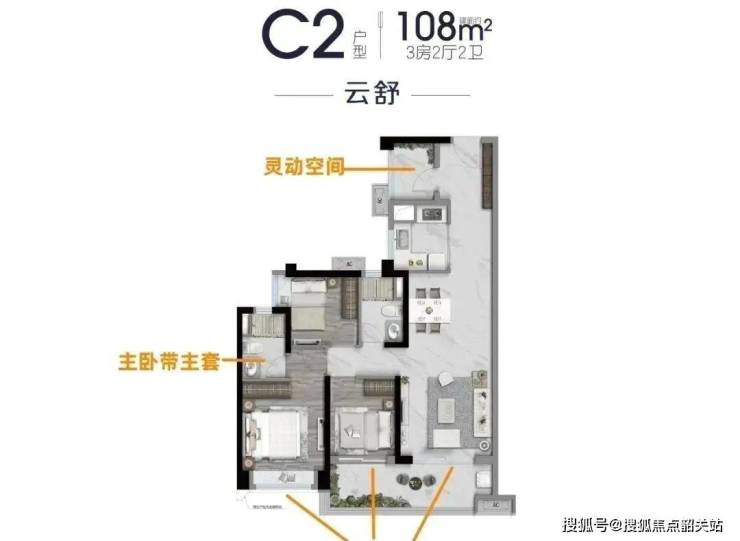 108平米3+1房两卫:有东南向和西南向可选,三开间朝南,主卧套房设计,总价约为400-440万元。
