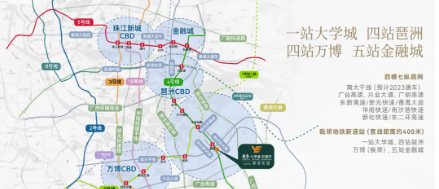 交通较为便捷。销售中心距离 4 号线新造站超过 2 公里,但实际在售位置走路过去地铁站约 900 多米,可接受。乘坐地铁 4 站可到万博、琶洲,5 站可达金融城。自驾方面优势明显,南大干线开通,串联起广州南站、汉溪长隆、万博 CBD 等番禺核心板块,5 分钟直达万博中心;金光东隧道通车,5 分钟直通大学城一期,实现大学城一二期资源的链接与整合,无论是日常通勤还是出行都较为便利。