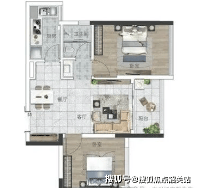 62㎡ 两房两厅一卫:格局方正明朗,东南向卧室,客厅出阳台,分离式卫生间。