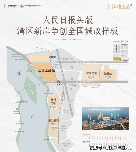 项目周边发展潜力巨大,湾区新岸(罗冲围)片区规划打造 “第二个珠江新城”,目前华为百亿智能汽车产业及 5000 人中国研发基地已落地,距项目仅 3km。该片区以华为为核心规划 “一带三产”,华为研发中心投入使用后将吸引 5000 高新人才进驻,未来预计实现约 600 亿生产总值,占据白云区 30%。生态环境方面,项目距离珠江仅 60 米,是广州在售项目中最靠近珠江的,私享 1000 米阔绰江岸线和 800 米巨幕江面,江景资源稀缺珍贵,居住在这里能尽享优美的江景风光,生活品质出众。