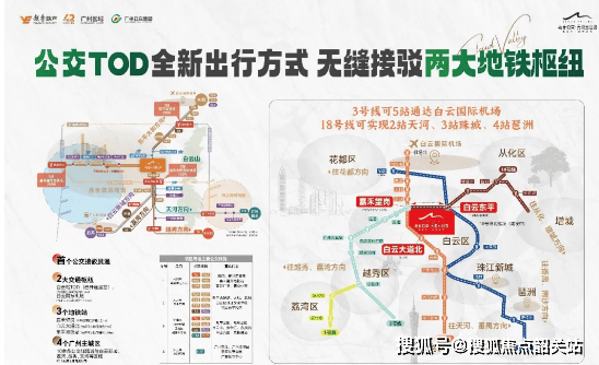 项目位于白云新城北部,临近白云大道,虽距离地铁 14 号线白云东平站约 1.7 公里、3 号线白云大道北站约 2.1 公里,但创新性打造公交 TOD 模式,成为交通亮点。项目整体抬高 18 米,楼下架空层设阳光公交站场与观景车库,业主可从小区电梯直达公交站,无缝接驳地铁 2 号线、3 号线、14 号线(二期在建)、18 号线北延段(在建),骑小电驴 8 分钟可达白云东平站与白云大道北站。