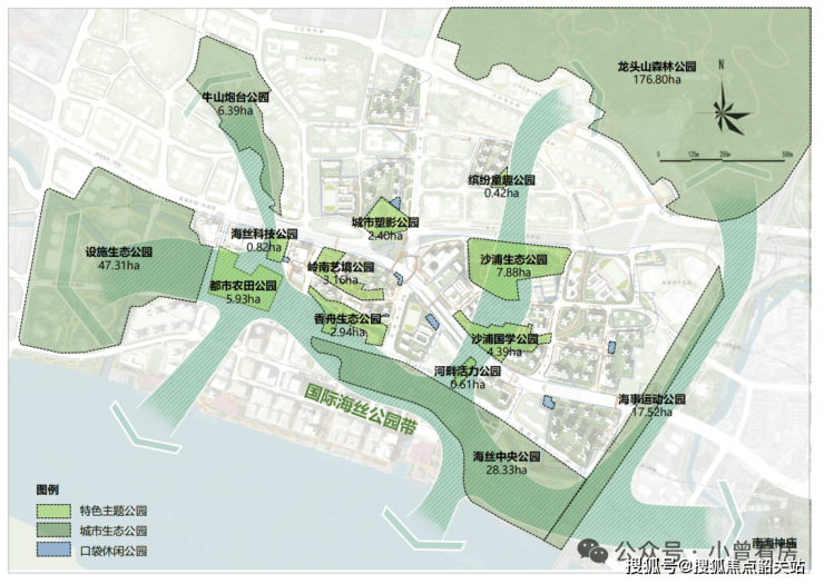 项目深度挖掘片区 600 余年的海丝文化底蕴,西接生态公园,东联南海神庙,构建串联 TOD 商业、文化街区、都市服务、生态社区的漫游活力轴,重点塑造双岗 TOD 中心、都市服务中心两大综合商业地标,以及双岗、沙涌两大休闲文化街区,将海丝文化底蕴与现代都市生活深度融合,打造既有文化底蕴,又有都市活力的人文居住空间。