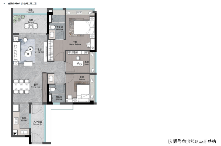 93㎡三房两卫:适合刚需家庭,得房率高,采光良好,功能区分合理。