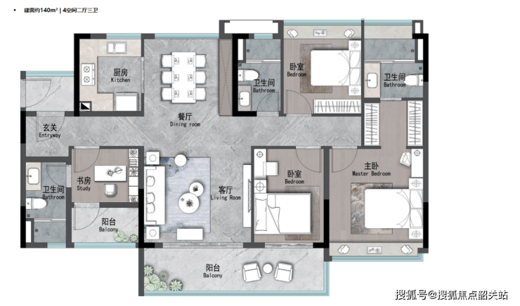 140㎡四房三卫:专为改善型家庭打造,南向布局,配备豪华主卧套间,充分考虑居住品质。