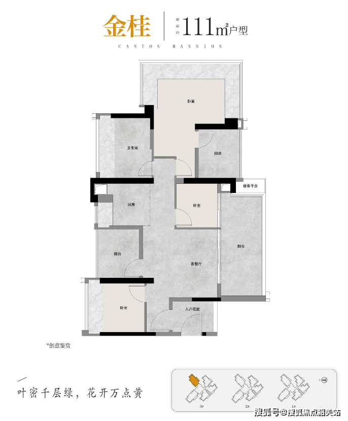 改善家庭:建议选择111平方米的四房户型。四开间朝南,厅房采光均衡,空间宽敞,适合三代同堂的家庭。