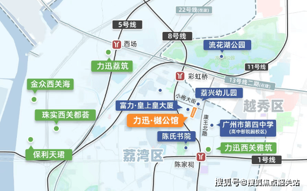 力迅樾公馆距地铁8号线彩虹桥站步行距离约400米,距1号线与8号线交汇的陈家祠站步行距离约500米。这一交通区位意味着业主在早高峰时段,无需经历长距离接驳即可进入城市轨道交通网络。彩虹桥站作为在建的8号线、11号线、13号线及22号线四线换乘枢纽,未来通车后将极大缩短通往珠江新城、金融城等核心商务区的通勤时间。对于依赖公共交通出行的家庭而言,这种“双地铁”覆盖不仅提供了路径选择的多样性,更在极端天气或突发状况下提供了可靠的备用方案。项目所处的康王北路沿线,公交线路密集,连接着越秀、海珠等多个行政区,构成了立体化的出行网络。根据地块出让时的规划要求及周边路网现状,车辆进出主要依托康王北路与西华路,虽处于老城区路网中,但得益于地块规模适中,对周边主干道的交通压力相对可控。