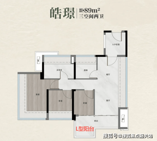 89㎡三房两卫:总价约228–244万,四开间朝东南,南北对流,配备入户花园与L型阳台,视野面向小区内部,私密性良好。