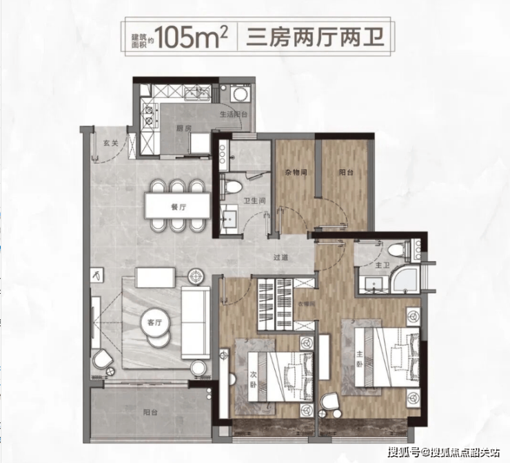 对于许多年轻夫妇或三口之家而言,105㎡的三房两厅两卫户型是当之无愧的主力选择。该户型总价约231万起,提供了A2、A2'两种微调方案,以满足不同家庭的个性化需求。