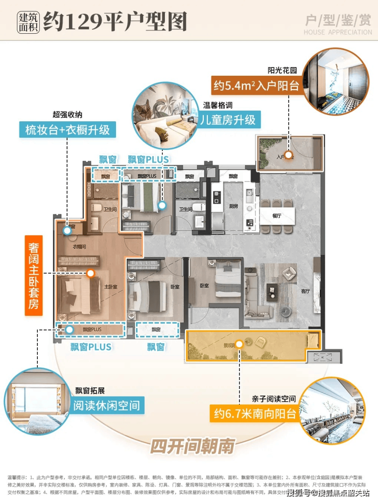 129㎡四开间朝南户型:拥有超大入户花园,南北对流通风良好。