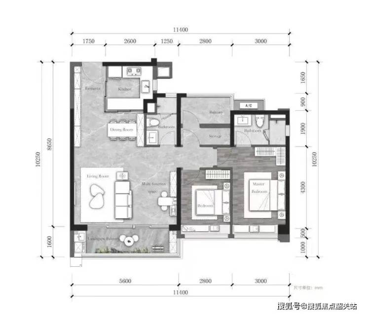 两条梯腿均为东南朝向,客厅做到了5.6米开间,远比一般竖厅的客厅开间舒服,此外做到了南向三面宽,次阳台可改房等等。
