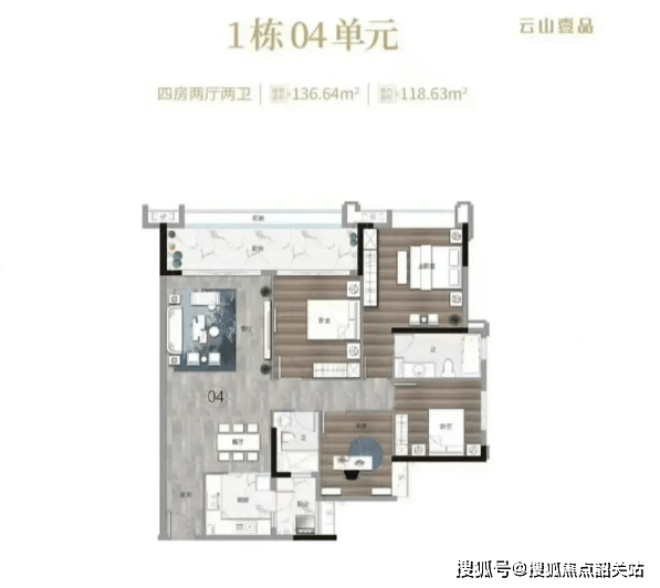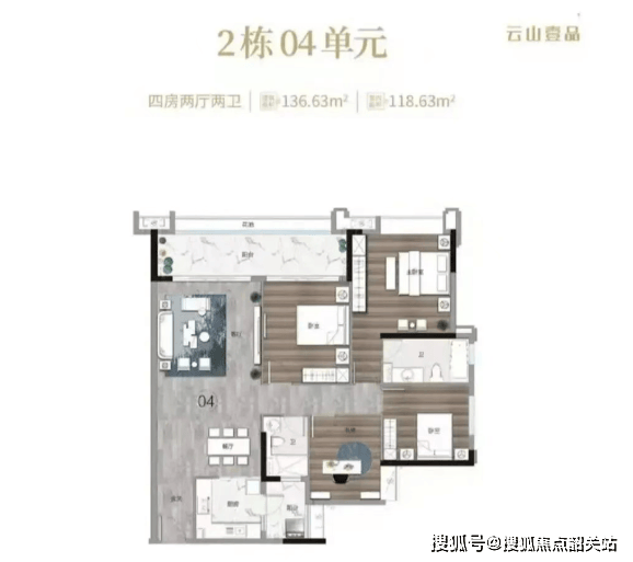 136㎡ 四房二卫户型:该户型设计宽敞舒适,注重居住者的日常生活需求,提供良好的通风和采光效果。