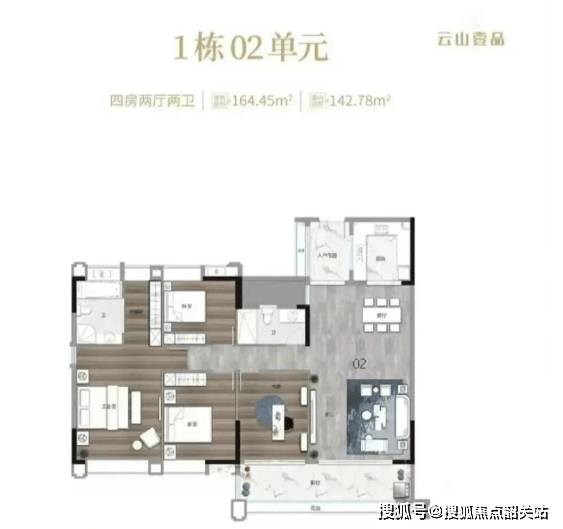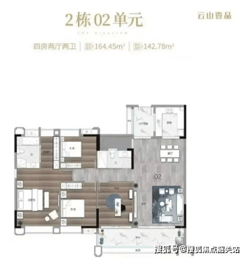 164㎡ 四房二卫户型:此户型更加豪华,不仅空间更为宽敞,而且设计上强调景观利用,让居住者能充分享受到白云山的美景。