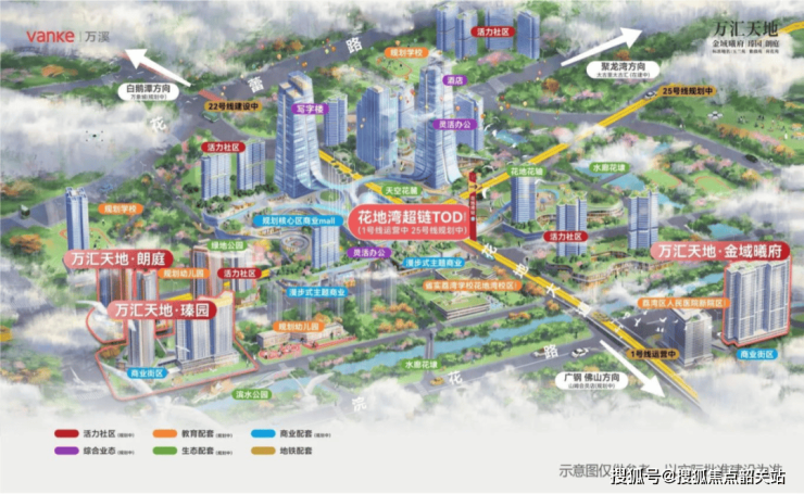 交通便利性:距离地铁1号线花地湾站仅500米,步行几分钟即可到达。此外,未来将有15条城市/城际轨道在此交汇,实现与大湾区各地的无缝连接。万汇天地还将引入“高线公园”,打造全新的天空花麓系统,缝合商业、写字楼等复合业态以及地铁花地湾站的空间,构建以地铁1号线(已开通)和25号线(规划中)为基础的双核TOD模式。