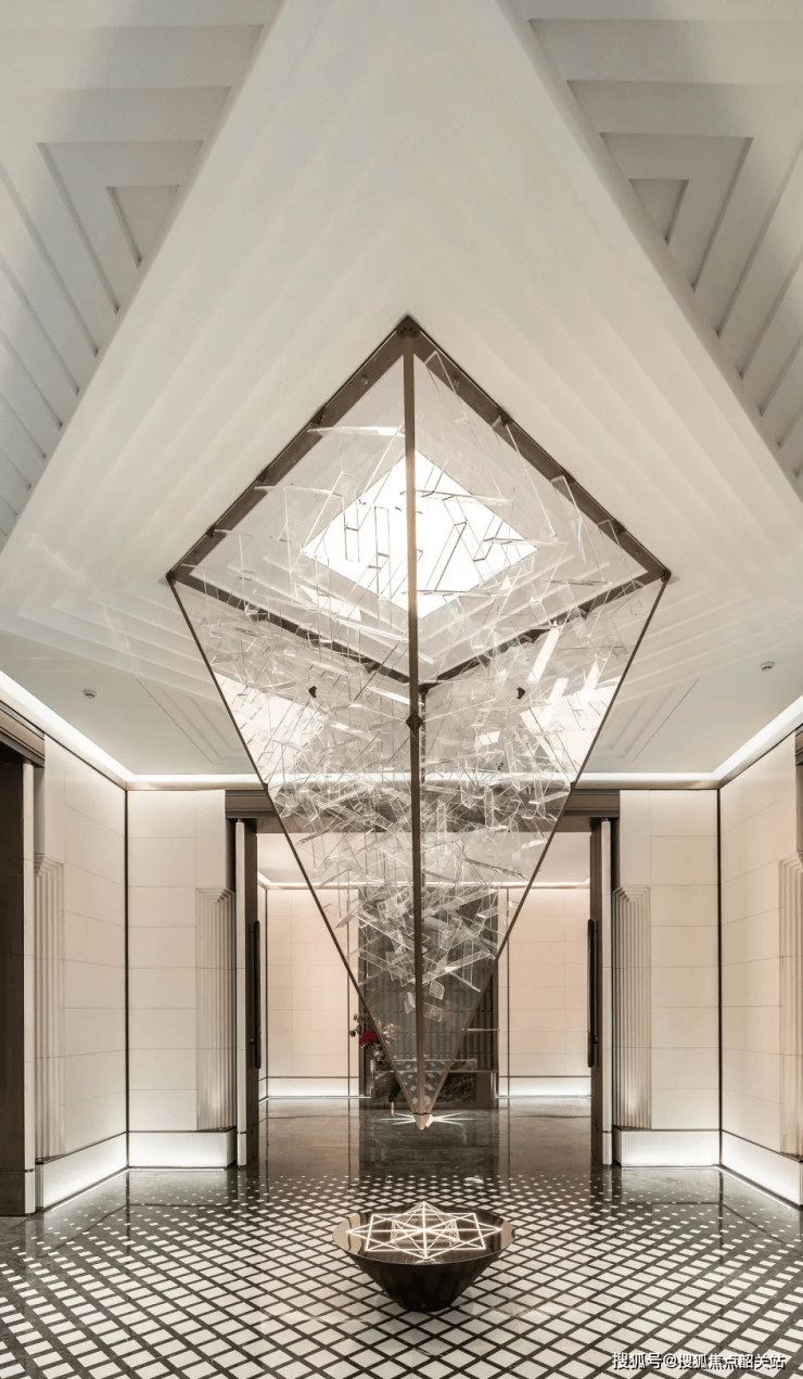 会所精装整体设计思路以序厅放射为轴,将阅读、休闲、茶饮、娱乐、休闲、等多元化的艺术形式在复合型活动场域呈现。经由入户大堂进入会所前厅,延续经典ArtDeco风格纹样金属屏风,充满空间摩登典雅的气息。步入序厅,经典复古的叠级造型天花和精致的艺术装置,营造出一个富有诗意的精神空间。