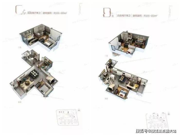 主力98-106平四房户型,其特别之处还在于,有阳光客厅和独立阳台,此外,还有9平米超大入户花园,空间设计别出心裁