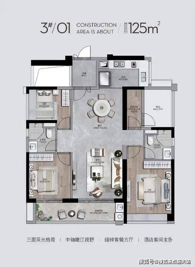 采用大面积玻璃幕墙、铝板,打造公建化外立面,对标滨江标杆项目汤臣一品。除了颜值高以外,还能让整座建筑更加通透。