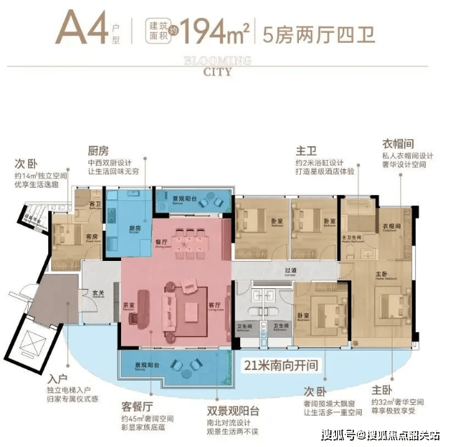 194㎡五房:南北对流双景观阳台,观景生活两不误,约32㎡奢华主套,配衣帽间