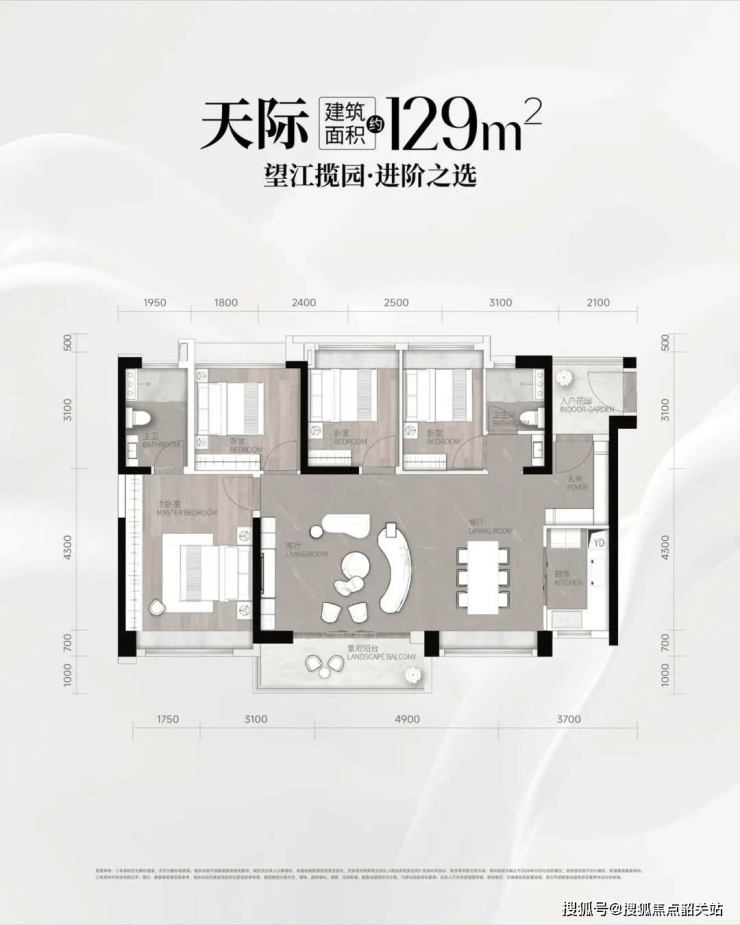 【天际组团·129㎡四房两厅两卫】建筑面积约129㎡,套内面积约105㎡,三面单边户型,采光通风无死角。客饭厅与景观阳台相连,视野开阔,可俯瞰社区园林与水岸景观;四房布局满足多孩家庭或三代同堂需求,主卧配备带浴缸的卫浴间,提升居住品质;功能阳台宽景设计,增加采光与储物空间。