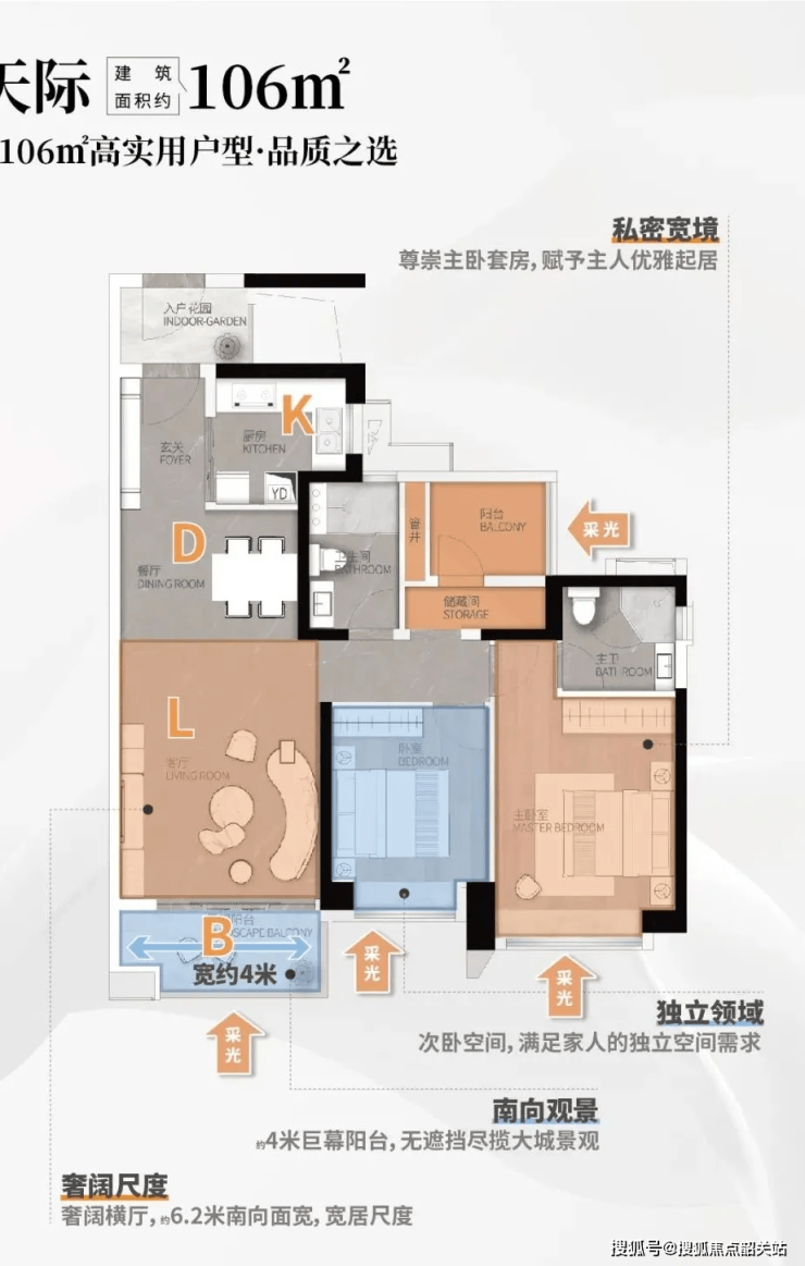 【天际组团·106㎡三房两厅两卫】建筑面积约106㎡,套内面积约86㎡,两梯四户设计,布局均衡,舒适度升级。客饭厅连通景观阳台,宽度达3.9米,采光通风一流;主卧配备独立卫浴与衣帽间,保障主人私密性;两间次卧空间充足,可灵活改造为儿童房、书房,满足家庭成长需求。