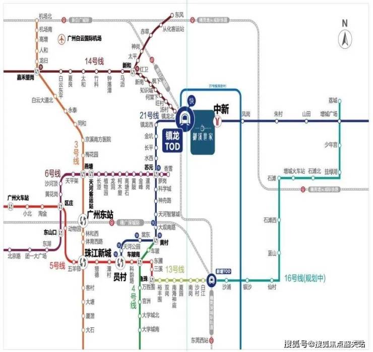 地铁21号线:距离项目最近的地铁站分别为中新站(900米)和镇龙站(1200米),快线两站即可抵达天河区的大观南路站,6站到达员村换乘5号线直达珠江新城。