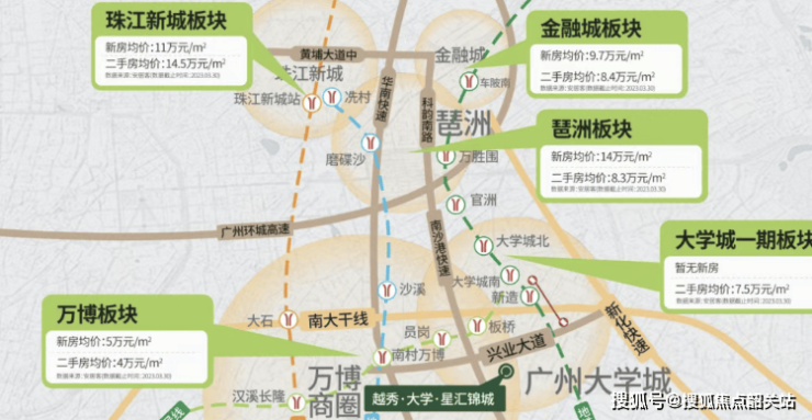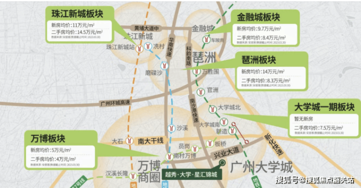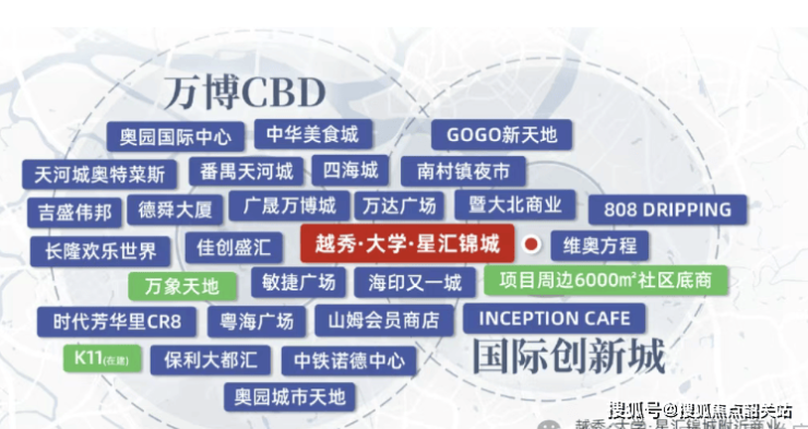 1. **占据城市黄金位置**:越秀大学·星汇锦城地处番禺南村板块,紧邻国际创新城,距离万博CBD仅8公里、大学城10公里,处于“万博-国际创新城-大学城”产业与生活圈的交汇节点,既享板块发展红利,又能承接核心商圈外溢需求。从资源集中度来看,项目虽非传统城芯,但周边3公里内市政配套逐步完善——医疗上,2公里内有南村医院(二级综合医院)、广东省第二人民医院(番禺院区,三级综合医院),日常就医与基础诊疗需求可满足;政务服务上,1.5公里内有南村镇政务服务中心,办理社保、户籍等业务无需远行;同时,项目依托南村成熟生活区,周边1公里内有小型超市、菜场、餐饮等基础设施,满足日常采购需求。更关键的是,项目临近南大干线(已全线通车)、兴业大道等主干道,快速衔接万博商圈的万达广场、天河城、山姆会员店等高端商业体,20分钟内可享受成熟商业配套,既避免了城芯的拥挤与高成本,又能便捷获取优质资源,成为刚需群体“近享繁华、低门槛入住”的优选区位。