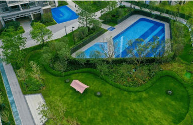 社区配套以 “生态 + 全龄” 为核心,弥补外部配套短板:2 万㎡“一园一会” 主题园林是项目核心亮点,规划静谧生态花园、健康跑道、儿童游乐区、老年活动中心等,业主可在园林中散步、健身、带娃,享受 “不出社区享休闲” 的便利;430㎡社区泳池位于园林内,夏季业主下楼即可游泳健身,搭配园林景观,营造 “度假般” 的休闲体验,在同区域刚需盘中实属少见。