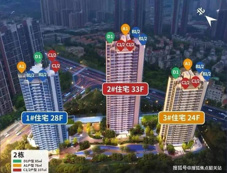 目前主要在售的是2号楼,共有四种户型:75㎡西北三房两厅一卫、85㎡东北三房两厅两卫、86㎡东北三房两厅两卫以及107㎡西南四房两厅两卫。所有户型均采用了蝶式布局,保证了360°无遮挡景观视野,提升了居住舒适度。特别是75㎡户型,实现了真正的三房设计,适合年轻一代追求品质生活的需要。