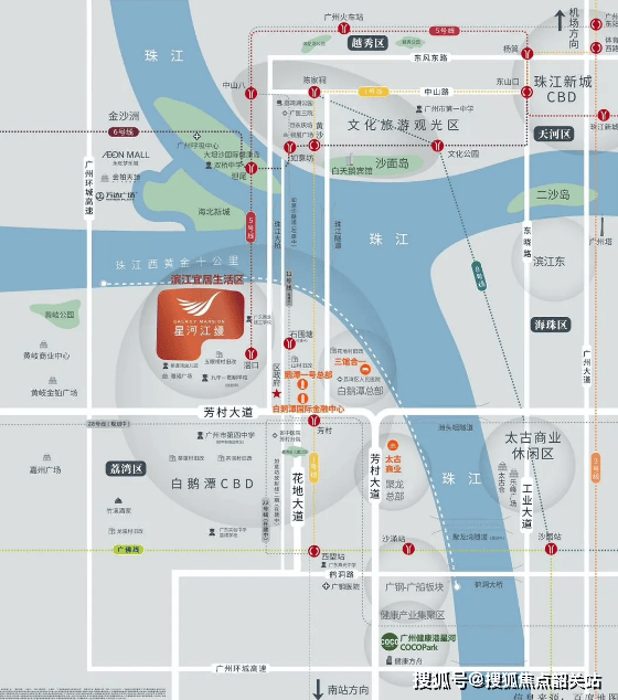 项目交通十分便捷,约 750m 即达 5 号线地铁滘口站,30 分钟可直达珠江新城。白鹅潭未来将有超 10 条地铁线路穿过,覆盖大湾区 1 小时交通生活圈,目前广佛线及地铁 1、5、6、8 号线已开通运营,10、11、22、25 号线等重要线路也在规划或建设中。驾车通过芳村大道,10 分钟可直抵荔湾白鹅潭 CBD 核心区域;未来白鹅潭大道通车后,约 4 公里可直达白鹅潭 CBD 腹地;如意坊隧道通车后,从内环路直达广珠西线仅需 10 分钟。
