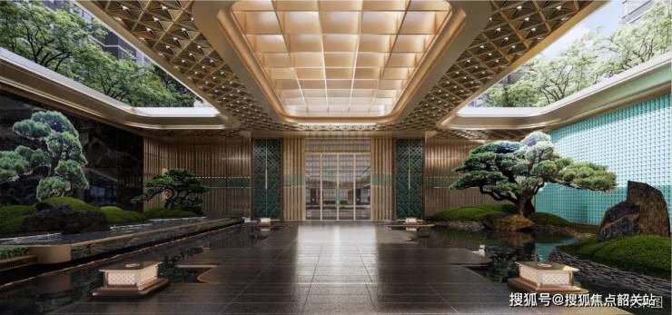 以“凤凰展翼”为灵感,设计约52米U字型超长门府界面,约7米高超尺度归家大堂,双层飘板塑造凤凰展翼的大气形态,居住者的气派门面