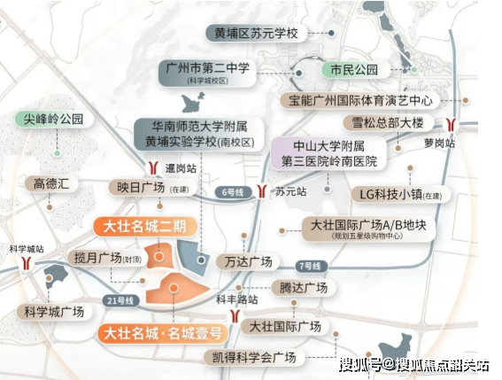黄埔大壮名城地处科学城板块核心,属于城市发展的重要区域。周边有 7 号线科丰路站、6 号线暹岗站、21 号线苏元站,一期距科丰路站约 500 米,二期距暹岗站约 600 米,步行约 10 分钟。7 号线 3 站直达老黄埔,换乘 5 号线到珠江新城、金融城;6/21 号线一站到天河。自驾有开创大道、开泰大道等干线,可通达广佛双城及主要城区,交通便捷。售楼处电话:4008285661