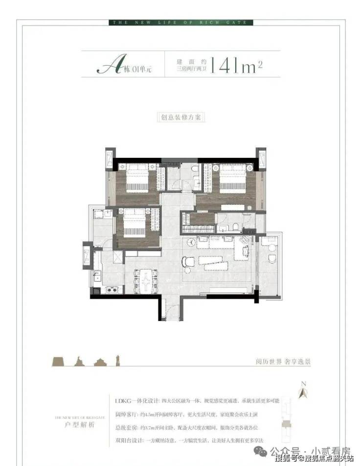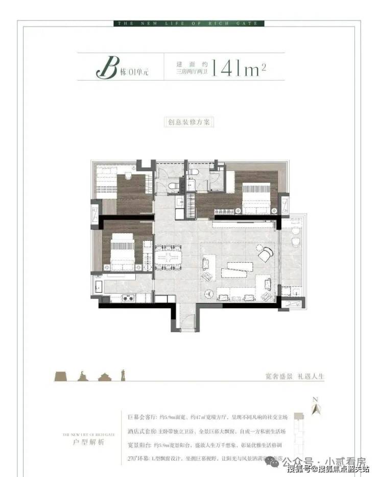 建面约141平方米三房两厅两卫:此为项目的明星户型,拥有“东西对流、大厅大房”的格局。约X.X米的横厅设计,连接超阔景观阳台,形成奢阔的LDK(客餐厨)一体化空间,家庭聚会、招待宾客气场十足。双套房设计,均配备独立卫生间,尊重每一位家庭成员的私密空间。东西双向阳台形成穿堂风,极大提升了居住的健康与舒适度。此户型是三代同堂家庭或追求宽邸生活的企业主之选。
