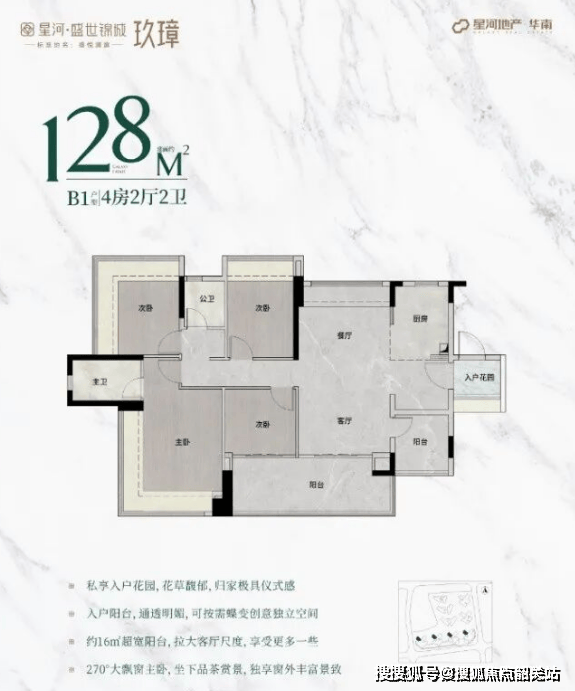 128㎡四房:8米横厅+双阳台结构,独立入户花园设计;