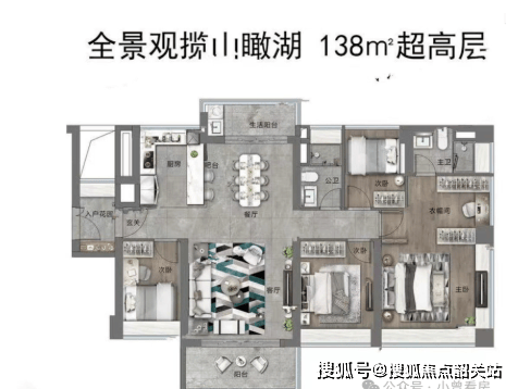138㎡四房:四面朝南,每个房间都有窗户,南北通透。