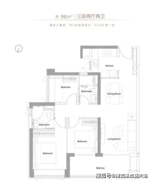 98㎡三房:南向设计,主卧带飘窗台,阳台连接客厅和次卧。