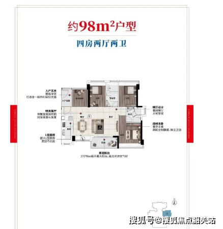 90-98㎡阔绰四房:针对改善需求设计,客厅与餐厅一体化布局,外接景观阳台,双卫生间均配备干湿分离系统,其中 98㎡户型主卧面积超 15㎡,居住体验媲美百平以上户型。