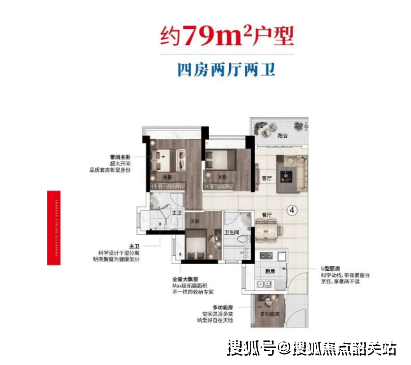 79㎡神级四房:采用 3+1 灵动设计,客厅连接南向阳台,主卧配备独立卫浴,通过优化过道布局实现空间零浪费,实测次卧最小面积达 8.5㎡,满足日常居住需求,完美适配刚需家庭。