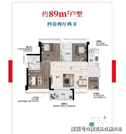 项目主打 79-98㎡全四房户型,是区域内少有的户户带主套的产品系列,目前在售 5 栋为 26 层两梯六户布局,涵盖四大热门户型: