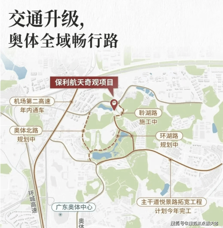 ✅ 全运会红利加持:十五届全运会即将开幕,主会场就在奥体中心,而保利辰园湖境距离奥体中心约3公里(高德地图实测,开车约10分钟),是全运会红利的核心辐射区。根据广州市政府规划,总投资680亿元,实施80个道路项目建设,打通“六横七纵”交通主动脉,全面升级奥体周边路网(数据来源:广州市住建局2026年重点工程公示)。