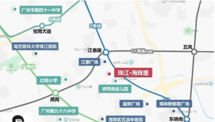 珠江・海珠里周边地铁线路密布,2 号线、8 号线、广佛线以及在建的 10 号线和 11 号环线环绕。虽最近的 2 号线江泰路地铁站步行距离约 1.3 公里,但多条线路的覆盖极大地提升了居民的出行便捷性。通过这些线路,居民可快速通达城市各处,无论是前往商务区工作,还是到城市其他区域休闲娱乐,都能轻松实现。