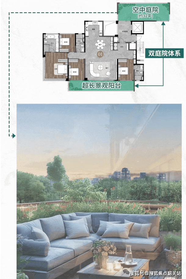 项目将第四代住宅的核心理念融入产品设计的每一处细节,打破了传统平层住宅的空间局限,以 “空中庭院” 的设计,将自然生态引入居家生活。所有楼栋的每层空中庭院均采用错位挑出设计,一上一下之间,庭院净高可达 6-6.3 米,相当于两层楼的高度,彻底解决了传统阳台采光不足、视野受限的问题,让空中庭院真正拥有了地面庭院的空间感与舒适度。偶数层户型更是标配最大约 60㎡的超大空中庭院,业主可以在自家的空中庭院里种花种草、打造私家花园,也可以摆放茶桌座椅、打造休闲会客区,甚至可以为孩子打造小型露营场地、游乐空间,足不出户就能享受有天有地的庭院生活,实现了 “城市中心的田园梦想”,彻底颠覆了传统平层住宅的居住体验。