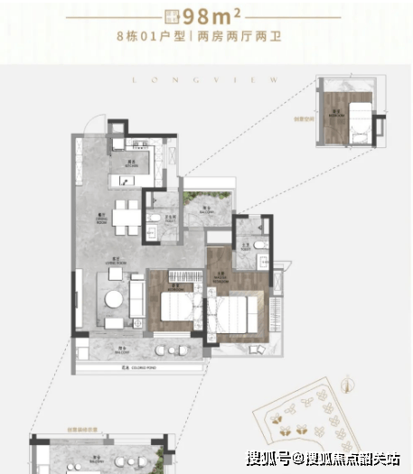 130平方米四房:有竖厅和横厅两种布局,景观阳台长达7.7米,LDKB一体化设计,主卧配备270度景观飘窗,总价620万元起。