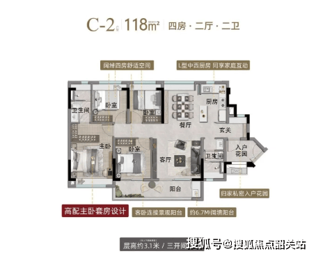 118㎡三房两卫(1/5 栋):采用 “LDK 一体化” 设计,客厅与餐厅通透相连,实测总面积约 35㎡,南向景观阳台长 6.1 米,主卧配备 270° 观景飘窗(可俯瞰梅花岭山景),实测得房率 87%,较同面积传统户型多 4㎡使用面积,目前仅剩 3 席。