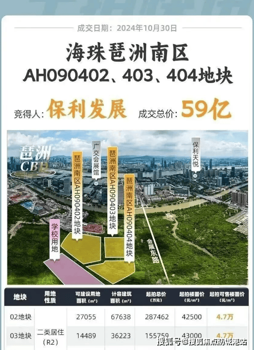 从拿地实力就能看出保利发展的底气:2024年10月30日,保利发展以59亿+的总价,拿下了广州“压箱底”的靓地——琶洲南三兄弟(AH090402号、03号、04号地块),这三块地总占地面积约6.66公顷,体量12.8万方,对应楼面价4.25万-4.3万/平(未扣除配建)。要知道,当时这三块地还是一宗无路无桥的生地,周边配套尚未落地,但保利发展依然果断出手,足以看出其对琶洲南区发展潜力的认可,也彰显了央企的资金实力与开发信心。