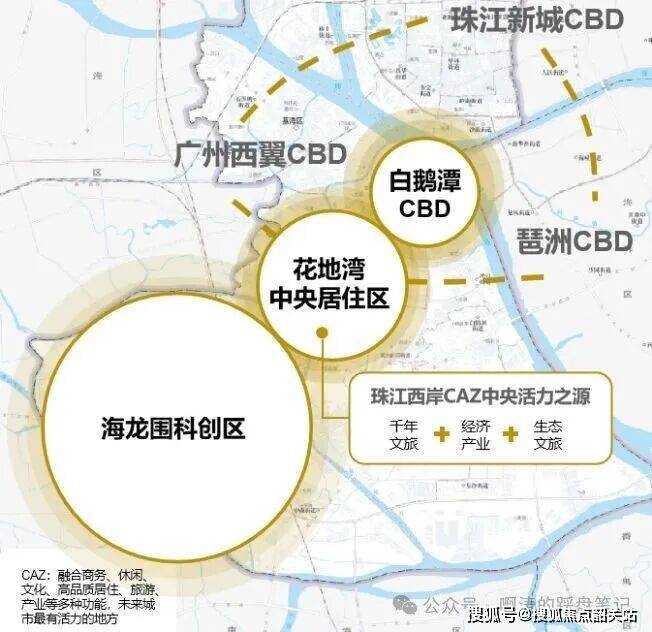 十四五规划中,荔湾“一带两区”建设是广州城芯发展之重,汇合“白鹅潭-花地湾-海龙围”打造“商、住、产”一体活力新城,构建珠江西岸CAZ黄金三极(千年文脉+经济产业+生态文旅)。