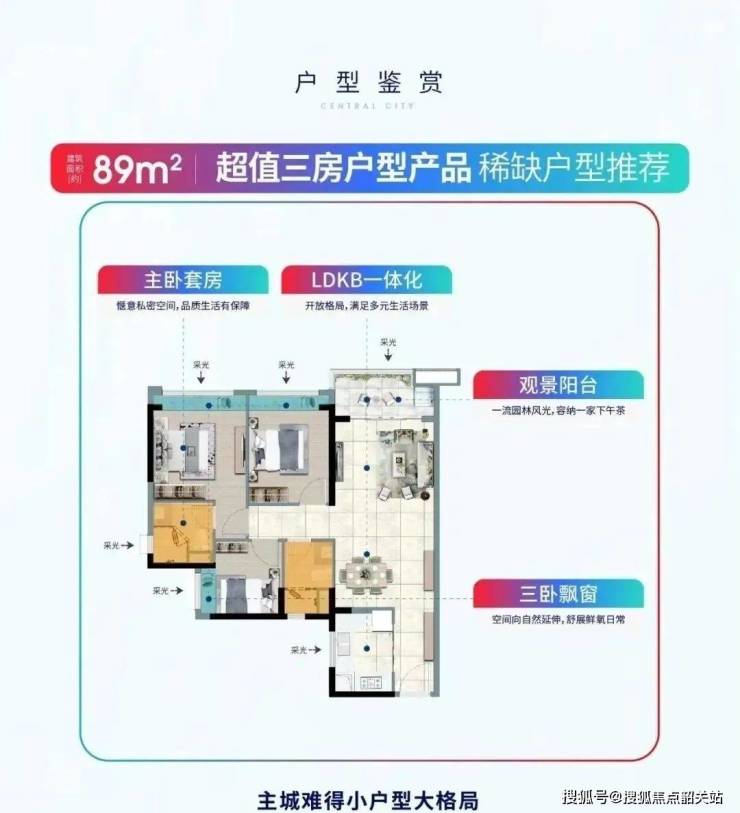 建面86平方米三房:动静分区,景观阳台可欣赏中心园林美景,三卧均设有大飘窗。
