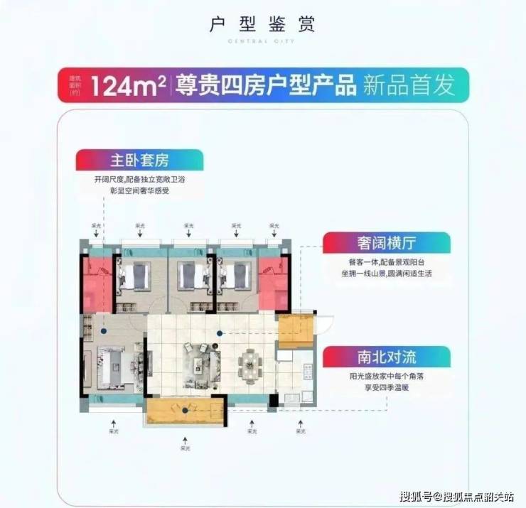 建面124平方米四房:四开间朝南,一线山景,南北对流横厅设计,主卧宽敞明亮。