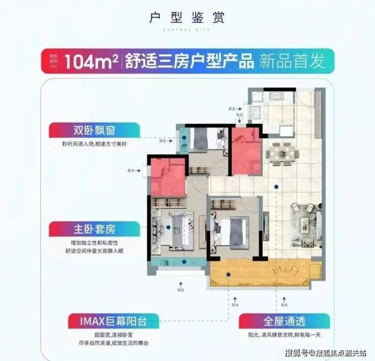 建面104平方米三房:全屋通透,大阳台设计,主卧为套房格局,增加了私密性。