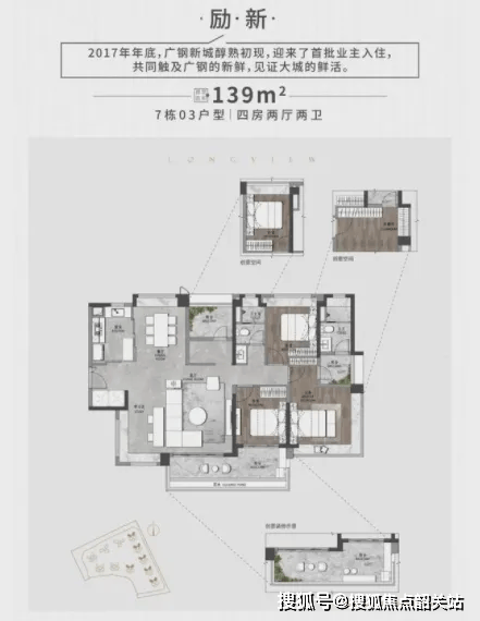 139㎡四房两厅两卫:南北对流,通风极佳;四房均方正实用,最小房间亦可轻松布置1.8米床+衣柜;餐客厅一体化设计,社交空间宽敞;总价约650–720万元,适合多代同堂或二胎家庭。